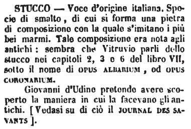 | Stucco - Voce d'origine italiana. Specie di smalto, di cui si forma una pietra di composizione con la quale s'imitano i più bei marmi. Tale composizione era nota agli antichi: sembra che Vitruvio parli dello stucco nei capitoli 2, 3 e 6 del libro VII, sotto il nome di opus albarium, od opus coronarium.