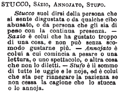| Stucco, Sazio, Annojato, Stufo - Stucco suol dirsi della persona che si sente disgustata o da qualche cibo abusato, o da persona che gli sia di peso con la continua presenza. - Sazio è colui che ha gustato troppo di una cosa, e non può senza scomodo gustarne più. - Annojato è colui a cui comincia a pesare o una lettura, o uno spettacolo, o altra cosa che non lo diletti. - Stufo è il sommo di tutte le uggie e le noje, ed è colui che sta per rinnegare la pazienza se non cessa la cagione che lo stucca o lo annoja. [immagine] |