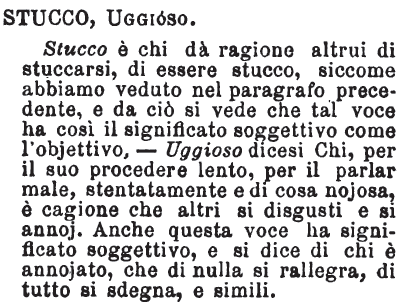 | Stucco, Uggioso - Stucco è chi dà ragione altrui di stuccarsi, di essere stucco, siccome abbiamo veduto nel paragrafo precedente, e da ciò si vede che tal voce ha così il significato soggettivo come l'objettivo, - Uggioso dicesi Chi, per il suo procedere lento, per il parlar male, stentatamente e di cosa nojosa, è cagione che latri si disgusti e si annoj. Anche questa voce ha significato soggettivo, e si dice di chi è annojato, che di nulla si rallegra, di tutto si sdegna, e simili. [immagine] |