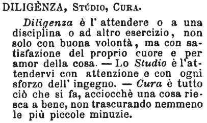 Diligenza, Studio, Cura - Diligenza è l'attendere o a una disciplina o ad altro esercizio, non solo con buona volontà, ma con satisfazione del proprio cuore e per amor della cosa. - Lo Studio è l'attendervi con attenzione e con ogni sforzo dell'ingegno. - Cura è tutto ciò che si fa, acciocché una cosa riesca bene, non trascurando nemmeno le più piccole minuzie. [immagine]