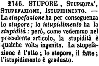 Stupore, Stupidità, Stupefazione, Istupidimento - La stupefazione ha per conseguenza lo stupore; lo istupidimento ha la stupidità; però, come vedemmo nel precedente articolo, la stupidità è qualche volta ingenita. La stupefazione è l'alto; lo stupore, il fatto; l'istupidimento è graduato. [immagine]
