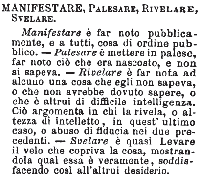 Manifestare, Palesare, Rivelare, Svelare - Manifestare è far noto pubblicamente, e a tutti, cosa di ordine pubblico. - Palesare è mettere in palese, far noto ciò che era nascosto, e non si sapeva. - Rivelare è far nota ad alcuno una cosa che egli non sapeva, o che non avrebbe dovuto sapere, o che è altrui di difficile intelligenza. Ciò argomenta in chi la rivela, o altezza di intelletto, in quest'ultimo caso, o abuso di fiducia nei due precedenti. - Svelare è quasi Levare il velo che copriva la cosa, mostrandola qual essa è veramente, soddisfacendo così all'altrui desiderio. [immagine]