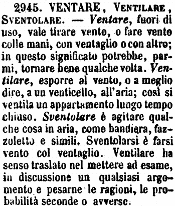 Ventare, Ventilare, Sventolare - Ventare, fuori di uso, vale tirare vento, o fare vento colle mani, con ventaglio o con altro; in questo significato potrebbe, parmi, tornare bene qualche volta. Ventilare, esporre al vento, o a meglio dire, a un venticello, all'aria; così si ventila un appartamento lungo tempo chiuso. Sventolare è agitare qualche cosa in aria, come bandiera, fazzoletto e simili. Sventolarsi è farsi vento col ventaglio. Ventilare ha senso traslato nel mettere ad esame, in discussione un qualsiasi argomento e pesarne le ragioni, le probabilità seconde o avverse. [immagine]