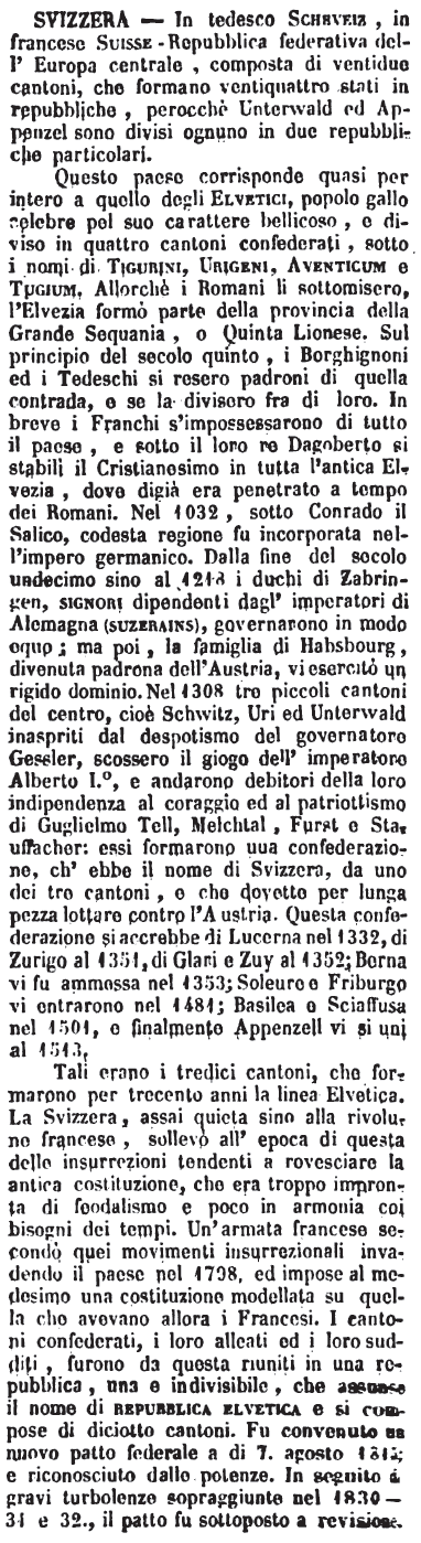 Svizzera - In tedesco Scheveiz, in francese Suisse - Repubblica federativa dell'Europa centrale, composta di ventidue cantoni, che formano ventiquattro stati in repubbliche, perocchè Unterwald ed Appenzel sono divisi ognuno in due repubbliche particolari.