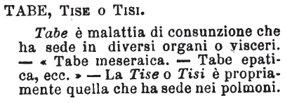 Tabe, Tise o Tisi - Tabe è malattia di consunzione che ha sede in diversi organi o visceri. - «Tabe meseraica. - Tabe epatica, ecc.» - La Tise o Tisi è propriamente quella che ha sede nei polmoni. [immagine]