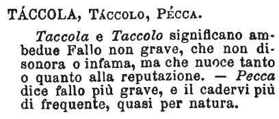 Taccola, Taccolo, Pecca - Taccola e Taccolo significano ambedue Fallo non grave, che non disonora o infama, ma che nuoce tanto o quanto alla reputazione. - Pecca dice fallo più grave, e il cadervi più di frequente, quasi per natura. [immagine]