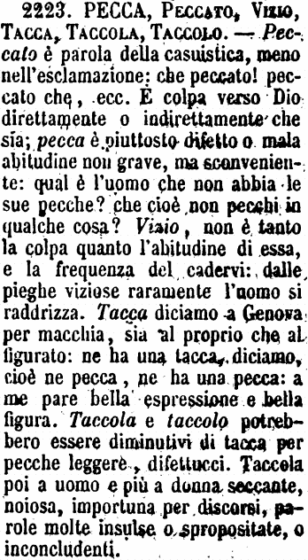 Pecca, Peccato, Vizio, Tacca, Taccola, Taccolo - Peccato è parola della casuistica, meno nell'esclamazione: che peccato! peccato che, ecc. È colpa verso Dio direttamente o indirettamente che sia; pecca è piuttosto difetto o mala abitudine non grave, ma sconveniente: qual è l'uomo che non abbia le sue pecche? che cioè non pecchi in qualche cosa? Vizio, non è tanto la colpa quanto l'abitudine di essa, e la frequenza del cadervi: dalle pieghe viziose raramente l'uomo si raddrizza. Tacca diciamo a Genova per macchia, sia al proprio che al figurato: ne ha una tacca, diciamo, cioè ne pecca, ne ha una pecca: a me pare bella espressione e bella figura. Taccola e taccolo potrebbero essere diminutivi di tacca per pecche leggere, difettucci. Taccola poi a uomo e più a donna seccante, noiosa, importuna per discorsi, parole molte insulse o spropositate, o inconcludenti. [immagine]