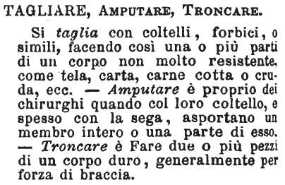 | Tagliare, Amputare, Troncare - Si taglia con coltelli, forbici, o simili, facendo così una o più parti di un corpo non molto resistente, come tela, carta, carne cotta o cruda, ecc. - Amputare è proprio dei chirurghi quando col loro coltello, e spesso con la sega, asportano un membro intero o una parte di esso. - Troncare è Fare due o più pezzi di un corpo duro, generalmente per forza di braccia. [immagine] |