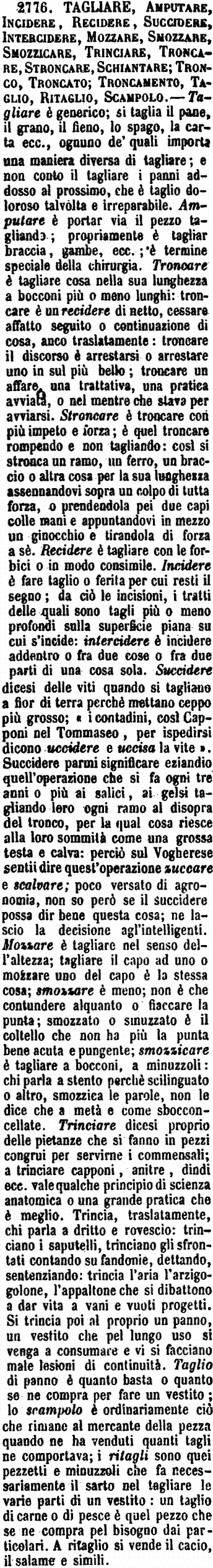 | Tagliare, Amputare, Incidere, Recidere, Succidere, Intercidere, Mozzare, Smozzare, Smozzicare, Trinciare, Troncare, Stroncare, Schiantare; Tronco, Troncato; Troncamento, Taglio, Ritaglio, Scampolo - Tagliare è generico; si taglia il pane, il grano, il fieno, lo spago, la carta ecc., ognuno de' quali importa una maniera diversa di tagliare; e non conto il tagliare i panni addosso al prossimo, che è taglio doloroso talvolta e irreparabile. Amputare è portar via il pezzo tagliando; propriamente è tagliar braccia, gambe, ecc.; è termine speciale della chirurgia. Troncare è tagliare cosa nella sua lunghezza a bocconi più o meno lunghi: troncare è un recidere di netto, cessare affatto seguito o continuazione di cosa, anco traslatamente: troncare il discorso è arrestarsi o arrestare uno in sul più bello; troncare un affare, una trattativa, una pratica avviata, o nel mentre che stava per avviarsi. Stroncare è troncare con più impeto e forza; è quel troncare rompendo e non tagliando: così si stronca un ramo, un ferro, un braccio o altra cosa per la sua lunghezza assennandovi sopra un colpo di tutta forza, o prendendola pei due capi colle mani e appuntandovi in mezzo un ginocchio e tirandola di forza a sè. Recidere è tagliare con le forbici o in modo consimile. Incidere è fare taglio o ferita per cui resti il segno; da ciò le incisioni, i tratti delle quali sono tagli più o meno profondi sulla superficie piana su cui s'incide: intercidere è incidere addentro o fra due cose o fra due parti di una cosa sola. Succidere dicesi delle viti quando si tagliano a fior di terra perchè mettano ceppo più grosso; «i contadini, così Capponi nel Tommaseo, per ispedirsi dicono uccidere e uccisa la vite». Succidere parmi significare eziandio quell'operazione che si fa ogni tre anni o più ai salici, ai gelsi tagliando loro ogni ramo al disopra del tronco, per la qual cosa riesce alla loro sommità come grossa testa e calva: perciò sul Vogherese sentii dire quest'operazione zuccare e scalvare; poco versato di agronomia, non so però se il succidere possa dir bene questa cosa; ne lascio la decisione agl'intelligenti. Mozzare è tagliare nel senso dell'altezza; tagliare il capo ad uno o mozzare uno del capo è la stessa cosa; smozzare è meno; non è che contundere alquanto o fiaccare la punta; smozzato o smuzzato è il coltello che non ha più la punta bene acuta e pungente; smozzicare è tagliare a bocconi, a minuzzoli: chi parla a stento perchè scilinguato o altro, smozzica le parole, non le dice che a metà e come sbocconcellate. Trinciare dicesi proprio delle pietanze che si fanno in pezzi congrui per servirne i commensali; a trinciare capponi, anitre, dindi ecc. vale qualche principio di scienza anatomica o una grande pratica che è meglio. Trincia, traslatamente, chi parla a dritto e rovescio: trinciano i saputelli, trinciano gli sfrontati contando su fandonie, dettando, sentenziando: trincia l'aria l'arzigogolone, l'appaltone che si dibattono a dar vita a vani e vuoti progetti. Si trincia poi al proprio un panno, un vestito che pel lungo uso si venga a consumare e vi si facciano male lesioni di continuità. Taglio di panno è quanto basta o quanto se ne compra per fare un vestito; lo scampolo è ordinariamente ciò che rimane al mercante della pezza quando ne ha venduti quanti tagli ne comportava; i ritagli sono quei pezzetti e minuzzoli che fa necessariamente il sarto nel tagliare le varie parti di un vestito: un taglio di carne o di pesce è quel pezzo che se ne compra pel bisogno dai particolari. A ritaglio si vende il cacio, il salame e simili. [immagine] |