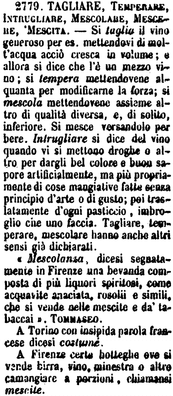 Tagliare, Temperare, Intrugliare, Mescolare, Mescere, Mescita - Si taglia il vino generoso per es. mettendovi di molt'acqua acciò cresca in volume; e allora si dice che l'è un mezzo vino; si tempera mettendovene alquanta per modificarne la forza; si mescola mettendovene assieme altro di qualità diversa, e, di solito, inferiore. Si mesce versandolo per bere. Intrugliare si dice del vino quando vi si mettono droghe o altro per dargli bel colore e buon sapore artificialmente, ma più propriamente di cose mangiative fatte senza principio d'arte o di gusto; poi traslatamente d'ogni pasticcio, imbroglio che uno faccia. Tagliare, temperare, mescolare hanno anche altri sensi già dichiarati.