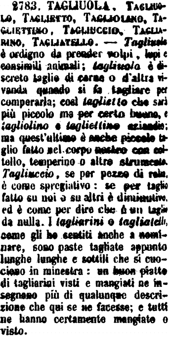 | Tagliuola, Tagliuolo, Taglietto, Tagliolano, Tagliettino, Tagliuccio, Tagliarino, Tagliatello - Tagliuola è ordigno da prender volpi, lupi e consimili animali; tagliuolo è discreto taglio di carne o d'altra vivanda quando si fa tagliare per comperarla; così taglietto che sarà più piccolo ma per certo buono, e tagliolino e tagliettino eziandio; ma quest'ultimo è anche piccolo taglio fatto nel corpo nostro con coltello, temperino o altro strumento. Tagliuccio, se per pezzo di roba, è come spregiativo: se per taglio fatto su noi o su altri è diminutivo, ed è come per dire che è un taglio da nulla. I tagliarini o tagliatelli, come gli ho sentiti anche a nominare, sono paste tagliate appunto lunghe lunghe e sottili che si cuociono in minestra: un buon piatto di tagliarini visti e mangiati ne insegnano più di qualunque descrizione che qui se ne facesse; e tutti ne hanno certamente mangiato o visto. [immagine] |