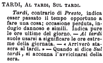 | Tardi, Al tardi, Sul tardi - Tardi, contrario di Presto, indica esser passato il tempo opportuno a fare una cosa; occasione perduta, indugio dannoso e simili. Indica pure le ore ultime del giorno. - Al tardi suole usarsi a significare le ore estreme della giornata. - «Arriverò stasera al tardi.» - Quando si dice Sul tardi, si accenna l'avvicinarsi della sera. [immagine] |