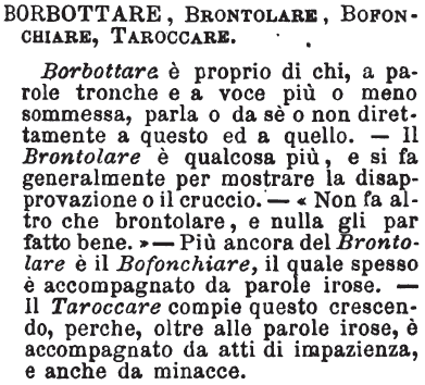 Borbottare, Brontolare, Bofonchiare, Taroccare - Borbottare è proprio di chi, a parole tronche e a voce più o meno sommessa, parla o da sè o non direttamente a questo ed a quello. - Il Brontolare è qualcosa più, e si fa generalmente per mostrare la disapprovazione o il cruccio. - «Non fa altro che brontolare, e nulla gli par fatto bene.» - Più ancora del Brontolare è il Bofonchiare, il quale spesso è accompagnato da parole irose. - Il Taroccare compie questo crescendo, perchè, oltre alle parole irose, è accompagnato da atti di impazienza, e anche da minacce. [immagine]