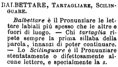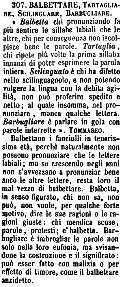 Balbettare, Tartagliare, Scilinguare, Barbugliare - «Balbetta chi pronunziando fa più sentire le sillabe labiali che le altre, chi per conseguenza non iscolpisce bene le parole. Tartaglia, chi ripete più volte la prima sillaba innanzi di poter esprimere la parola intiera. Scilinguato è chi ha difetto nello scilinguagnolo, e non potendo volgere la lingua con la debita agilità, non può proferire spedito e netto; al quale insomma, nel pronunziare, manca qualche lettera. Barbugliare è parlare in gola con parole interrotte». Tommaseo.