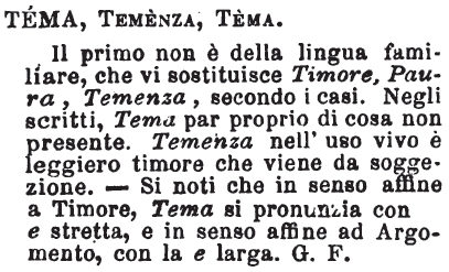 | Tema, Temenza - Il primo non è della lingua familiare, che vi sostituisce Timore, Paura, Temenza, secondo i casi. Negli scritti, Tema par proprio di cosa non presente. Temenza nell'uso vivo è leggiero timore che viene da soggezione. - Si noti che in senso affine a Timore, Tema si pronunzia con e stretta, e in senso affine ad Argomento, con la e larga. G. F. [immagine] |