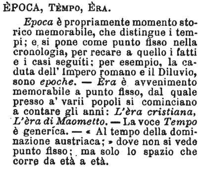 | Epoca, Tempo, Era - Epoca è propriamente momento storico memorabile, che distingue i tempi; e si pone come punto fisso nella cronologia, per recare a quello i fatti e i casi seguiti; per esempio, la caduta dell'Impero romano e il Diluvio, sono epoche. - Era è avvenimento memorabile a punto fisso, dal quale presso a'varii popoli si cominciano a contare gli anni: L'èra cristiana, L'èra di Maometto. - La voce Tempo è generica. - « Al tempo della dominazione austriaca; » dove non si vede punto fisso; ma solo lo spazio che corre da età a età. [immagine] |