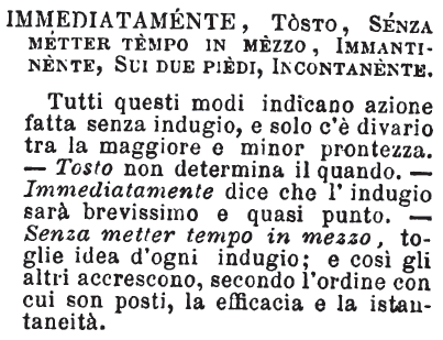 | Immediatamente, Tosto, Senza metter tempo in mezzo, Immantinente, Sui due piedi, Incontanente - Tutti questi modi indicano azione fatta senza indugio, e solo c'è divario tra la maggiore e minor prontezza. - Tosto non determina il quando. - Immediatamente dice che l'indugio sarà brevissimo e quasi punto. - Senza metter tempo in mezzo, toglie idea d'ogni indugio; e così gli altri accrescono, secondo l'ordine con cui son posti, la efficacia e la istantaneità. [immagine] |