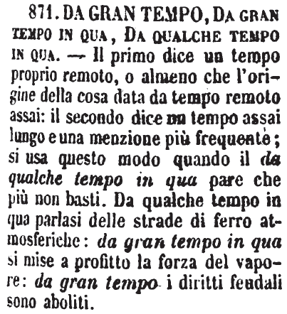 | Da gran tempo, Da gran tempo in qua, Da qualche tempo in qua - Il primo dice un tempo proprio remoto, o almeno che l'origine della cosa data da tempo remoto assai: il secondo dice un tempo assai lungo e una menzione più frequente; si usa questo modo quando il da qualche tempo in qua pare che più non basti. Da qualche tempo in qua parlasi delle strade di ferro atmosferiche: da gran tempo in qua si mise a profitto la forza del vapore: da gran tempo i diritti feudali sono aboliti. [immagine] |