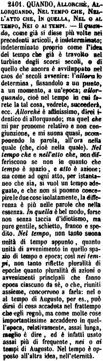 | Quando, Allorché, Allorquando, Nel tempo che, Nell'atto che, In quella, Nel o Al tempo, Nei o Ai tempi - Il quando, come già si disse più volte nei precedenti articoli, è indeterminato; indeterminato proprio come l'idea del tempo che già è travolto nel turbine degli scorsi secoli, e di quello che ancora è avviluppato nel caos de' secoli avvenire: l'allora lo determina, fissandolo a un punto, a un momento, a un'epoca; allorquando, cioè nel tempo in cui farete la tal cosa, vedrete, succederà, ecc. Allorchè è affinissimo, direi identico di allorquando; ma quel che mi par pronome relativo e non congiunzione, e mi suona quasi, scomponendo la parola, all'ora nella quale (che, cioè nella quale). Nel tempo che e nell'atto che, non differiscono se non in quanto che tempo è spazio, e atto è azione; ma come ad ogni atto, per istantaneo che sia, si vuol un tempo adeguato, e che non si puonno concepire le due cose isolatamente, la differenza è più nelle parole che nella essenza. In quella è bel modo, forse non senza taccia d'idiotismo, ma pure gentile, schietto, franco e spedito. Nel tempo, non tanto suona unità di tempo appunto, quanto unità di avvenimento in quello spazio di tempo o epoca; così nei tempi, non tanto riflette pluralità di epoche quanto pluralità di azioni o avvenimenti principali che fanno epoca ciascuno da sè, o che, riuniti assieme, concorrono a farla: nel o al tempo di Augusto, per es., può dirsi di cosa accaduta nel frattempo che egli regnò, ma come molte cose importantissime accaddero in quell'epoca, relativamente, assai lunga, meglio è dire, ed è infatti usato assai più di frequente, nei o ai tempi di Augusto. Nel tempo è opposto all'altra idea, nell'eternità. [immagine] |
