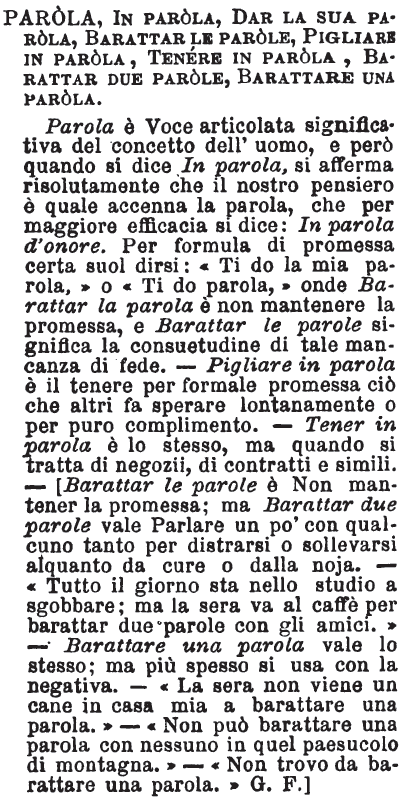 | Parola, In parola, Dar la sua parola, Barattar le parole, Pigliare in parola, Tenere in parola, Barattar due parole, Barattare una parola - Parola è Voce articolata significativa del concetto dell'uomo, e però quando si dice In parola, si afferma risolutamente che il nostro pensiero è quale accenna la parola, che per maggiore efficacia si dice: In parola d'onore. Per formula di promessa certa suol dirsi: « Ti do la mia parola, » o « Ti do parola, » onde Barattar la parola è non mantenere la promessa, e Barattar le parole significa la consuetudine di tale mancanza di fede. - Pigliar in parola è il tenere per formale promessa ciò che altri fa sperare lontanamente o per puro complimento. - Tener in parola è lo stesso, ma quando si tratta di negozii, di contratti e simili. - [Barattar le parole è Non mantener la promessa; ma Barattar due parole vale Parlare un po' con qualcuno tanto per distrarsi o sollevarsi alquanto da cure o dalla noja. - « Tutto il giorno sta nello studio a sgobbare; ma la sera va al caffè per barattar due parole con gli amici. » - Barattare una parola vale lo stesso; ma più spesso si usa con la negativa. - « La sera non viene un cane in casa mia a barattare una parola. » - « Non può barattare una parola con nessuno in quel paesucolo di montagna. » - « Non trovo da barattare una parola. » G. F.] [immagine] |