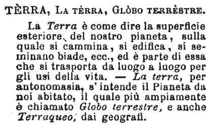 Terra, La terra, Globo terrestre - La Terra è come dire la superficie esteriore del nostro pianeta, sulla quale si cammina, si edifica, si seminano biade, ecc., ed è parte di essa che si trasporta da luogo a luogo per gli usi della vita. La terra, per antonomasia, s'intende il Pianeta da noi abitato, il quale più ampiamente è chiamato Globo terrestre, e anche Terraqueo, dai geografi. [immagine]