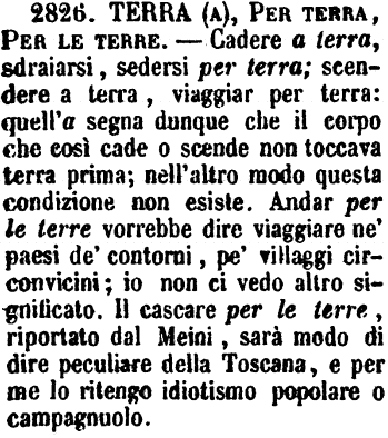 Terra (a), Per terra, Per le terre - Cadere a terra, sdraiarsi, sedersi per terra; scendere a terra, viaggiar per terra: quell'a segna dunque che il corpo che così cade o scende non toccava terra prima; nell'altro modo questa condizione non esiste. Andar per le terre vorrebbe dire viaggiare ne' paesi de' contorni, pe' villaggi circonvicini; io non ci vedo altro significato. Il cascare per le terre, riportato dal Meini, sarà modo di dire peculiare della Toscana, e per me lo ritengo idiotismo popolare o campagnuolo. [immagine]