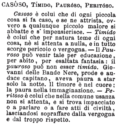 Casoso, Timido, Pauroso, Peritoso - Casoso è colui che di ogni piccola cosa si fa caso, e se ne attrista, ovvero a qualunque piccolo malore si abbatte e s'impensierisce. - Timido è colui che per natura teme di ogni cosa, nè si attenta a nulla, e in tutto scorge pericolo o vergogna. - Il Pauroso può venir tale per educazione, per abito, per esaltata fantasia: il pauroso può non esser timido. Giovanni delle Bande Nere, prode e audace capitano, aveva paura a star solo la notte. Il timore è nel cuore; la paura nell'immaginazione. - Peritoso è colui che nella comune usanza non si attenta, e si trova impacciato o a parlare o a fare atti di civiltà, lasciandosi sopraffare dalla vergogna e dal troppo rispetto. [immagine]