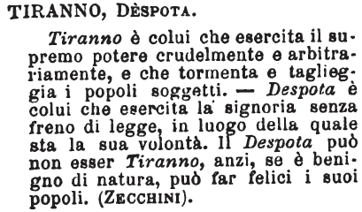 Tiranno, Despota - Tiranno è colui che esercita il supremo potere crudelmente e arbitrariamente, e che tormenta e taglieggia i popoli soggetti. - Despota è colui che esercita la signoria senza freno di legge, in luogo della quale sta la sua volontà. Il Despota può non esser Tiranno, anzi, se è benigno di natura, può far felici i suoi popoli. (Zecchini). [immagine]