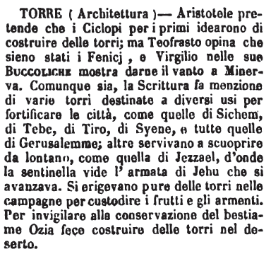 | Torre (Architettura) - Aristotele pretende che i Ciclopi per i primi idearono di costruire delle torri; ma Teofrasto opina che sieno stati i Fenicj, e Virgilio nelle sue Buccoliche mostra darne il vanto a Minerva. Comunque sia, la Scrittura fa menzione di varie torri destinate a diversi usi per fortificare le città, come quelle di Sichem, di Tebe, di Tiro, di Syene, e tutte quelle di Gerusalemme; altre servivano a scuoprire da lontano, come quella di Jezzael, d'onde la sentinella vide l'armata di Jehu che si avanzava. Si erigevano pure delle torri nelle campagne per custodire i frutti e gli armenti. Per invigilare alla conservazione del bestiame Ozia fece costruire delle torri nel deserto. [immagine] |