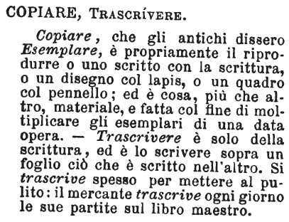 | Copiare, Trascrivere - Copiare, che gli antichi dissero Esemplare, è propriamente il riprodurre o uno scritto con la scrittura, o un disegno col lapis, o un quadro col pennello; ed è cosa, più che altro, materiale, e fatta col fine di moltiplicare gli esemplari di una data opera. - Trascrivere è solo della scrittura, ed è lo scrivere sopra un foglio ciò che è scritto nell'altro. Si trascrive spesso per mettere al pulito: il mercante trascrive ogni giorno le sue partite sul libro maestro. [immagine] |