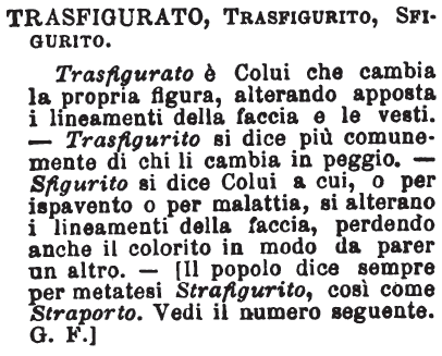 | Trasfigurato, Trasfigurito, Sfigurito - Trasfigurato è Colui che cambia la propria figura, alterando apposta i lineamenti della faccia e le vesti. - Trasfigurito si dice più comunemente di chi li cambia in peggio. - Sfigurito si dice Colui a cui, o per ispavento o per malattia, si alterano i lineamenti della faccia, perdendo anche il colorito in modo da parer un altro. - [Il popolo dice sempre per metatesi Strafigurito, così come Straporto. Vedi il numero seguente. G. F.] [immagine] |
