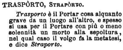 | Trasporto, Straporto - Trasporto è il Portar cosa alquanto grave da un luogo all'altro, e spesso si usa per il Portare con più o meno solennità un morto alla sepoltura, nel qual caso il volgo fa la metatesi, e si dice Straporto. [immagine] |