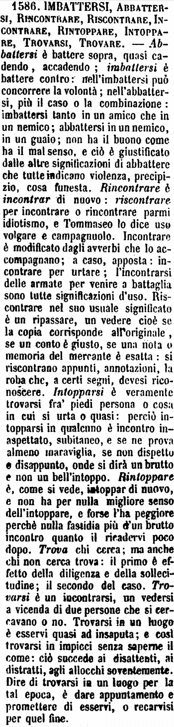Imbattersi, Abbattersi, Rincontrare, Riscontrare, Incontrare, Rintoppare, Intoppare, Trovarsi, Trovare - Abbattersi è battere sopra, quasi cadendo, accadendo; imbattersi è battere contro: nell'imbattersi può concorrere la volontà; nell'abbattersi, più il caso o la combinazione: imbattersi tanto in un amico che in un nemico; abbattersi in un nemico, in un guaio; non ha il buono come ha il mal senso, e ciò è giustificato dalle altre significazioni di abbattere che tutte indicano violenza, precipizio, cosa funesta. Rincontrare è incontrar di nuovo: riscontrare per incontrare o rincontrare parmi idiotismo, e Tommaseo lo dice uso volgare e campagnuolo. Incontrare è modificato dagli avverbi che lo accompagnano; a caso, apposta: incontrare per urtare; l'incontrarsi delle armate per venire a battaglia sono tutte significazioni d'uso. Riscontrare nel suo usuale significato è un ripassare, un vedere cioè se la copia corrisponde all'originale, se un conto è giusto, se una nota o memoria del mercante è esatta: si riscontrano appunti, annotazioni, la roba che, a certi segni, devesi riconoscere. Intopparsi è veramente trovarsi fra' piedi persona o cosa in cui si urta o quasi: perciò intopparsi in qualcuno è incontro inaspettato, subitaneo, e se ne prova almeno maraviglia, se non dispetto o disappunto, onde si dirà un brutto e non un bell'intoppo. Rintoppare è, come si vede, intoppar di nuovo, e non ha per nulla migliore senso dell'intoppare, e forse l'ha peggiore perchè nulla fastidia più d'un brutto incontro quanto il ricadervi poco dopo. Trova chi cerca; ma anche chi non cerca trova: il primo è effetto della diligenza e della sollecitudine; il secondo del caso. Trovarsi è un incontrarsi, un vedersi a vicenda di due persone che si cercavano o no. Trovarsi in un luogo è esservi quasi ad insaputa; e così trovarsi in impicci senza saperne il come: ciò succede ai disattenti, ai distratti, agli allocchi soventemente. Dire di trovarsi in un luogo per la tal epoca, è dare appuntamento e promettere di esservi, o recarvisi per quel fine. [immagine]