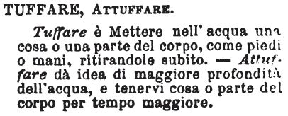 Tuffare - V. a. Immergere in acqua o in altro liquido una cosa, e per lo più cavandola subito fuori. Suono imit. Rammenta il gr. Τύπτω, perf. Τέ-τυφα. = Pallad. Febbr. 27. (C) E poi in quella (acqua salsa) raffreddata tuffano le pere; e un pochetto state iv'entro, le ne traggono. Ovid. Simint. 1. 128. (Man.) Oh quante volte tuffòe le braccia nelle mezze acque per abbracciare lo veduto collo.