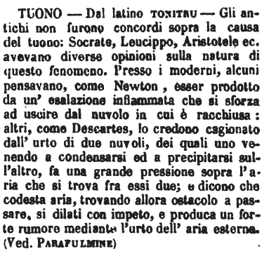| Tuono - Dal latino tonitru - Gli antichi non furono concordi sopra la causa del tuono: Socrate, Leucippo, Aristotele ec. avevano diverse opinioni sulla natura di questo fenomeno. Presso i moderni, alcuni pensavano, come Newton, esser prodotto da un'esalazione infiammata che si sforza ad uscire dal nuvolo in cui è racchiusa: altri, come Descartes, lo credono cagionato dall'urto di due nuvoli, dei quali uno vennendo a condensarsi ed a precipitarsi sull'altro, fa una grande pressione sopra l'aria che si trova fra essi due; e dicono che codesta aria, trovando allora ostacolo a passare, si dilati con impeto, e produca un forte rumore mediante l'urto dell'aria esterna. (Ved. Parafulmine) [immagine] |
