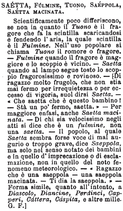 | Saetta, Fulmine, Tuono, Saeppola, Saetta, Macinata - Scientificamente poco differiscono, se non in quanto il Tuono è il fragore che fa la scintilla scaricandosi e fendendo l'aria, la quale scintilla è il Fulmine. Nell'uso popolare si chiama Tuono il romore o fragore. - Fulmine quando il fragore è maggiore e lo scoppio è vicino. - Saetta quando al lampo segue tosto lo scoppio fragorosissimo e rovinoso. - [Di ragazzo molto frugolo, che non stia mai fermo per irrequietezza o per eccesso di vigoria, suol dirsi Saetta. - «Che saetta che è questo bambino! - Stà un po' fermo, saetta.» - Per maggiore enfasi, anche Saetta macinata. - Di chi sia velocissimo negli atti si dice che è un fulmine, non una saetta. - Il popolo, al quale Saetta sembra forse voce di mal augurio o troppo grave, dice Saeppola, ma solo nel senso notato dei bambini e in quello d'imprecazione o di esclamazione, non in quello del noto fenomeno meteorologico. - «Ragazzo che è una saeppola - una saeppola macinata. - Ti dia la saeppola.» - Forma simile, quanto all'intento, a Diascolo, Diancine, Perdinci, Capperi, Càttera, Càspita, e altre mille. G. F.] [immagine] |