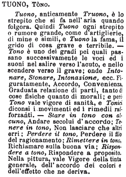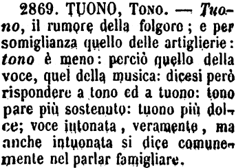 | Tuono, Tono - Tuono, il rumore della folgore; e per somiglianza quello delle artiglierie: tono è meno: perciò quello della voce, quel della musica: dicesi però rispondere a tono ed a tuono: tono pare più sostenuto: tuono più dolce; voce intonata, veramente, ma anche intuonata si dice comunemente nel parlar famigliare. [immagine] |