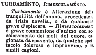 | Turbamento, Rimescolamento - Turbamento è Alterazione della tranquillità dell'animo, procedente o da triste novella, o da qualunque grave dispiacere. - Rimescolamento è grave commozione d'animo con acceleramento dei moti del cuore, cagionata da spavento, da qualche spettacolo doloroso e improvviso, e da simili cagioni. [immagine] |