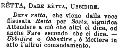 Retta, Dare retta, Ubbidire - Dare retta, che viene dalla voce disusata Retta per Sosta, significa Attendere a ciò che altri ci dice, od anche Fare secondo che ci dice. - Ubbidire o Obbedire, è Mettere in atto l'altrui comandamento. [immagine]