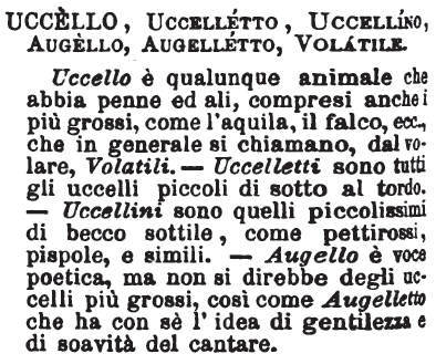 Uccello, Uccelletto, Uccellino, Augello, Augelletto, Volatile - Uccello è qualunque animale che abbia penne ed ali, compresi anche i più grossi, come l'aquila, il falco, ecc., che in generale si chiamano, dal volare, Volatili. - Uccelletti sono tutti gli uccelli piccoli di sotto al tordo. - Uccellini sono quelli piccolissimi di becco sottile, come pettirossi, pispole, e simili. - Augello è voce poetica, ma non si direbbe degli uccelli più grossi, così come Augelletto che ha con sè l'idea di gentilezza e di soavità del cantare. [immagine]
