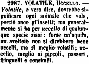 Volatile, Uccello - Volatile, a vero dire, dovrebbe significare ogni animale che vola, perciò anco gl'insetti; ma generalmente si ha per uccello di qualunque specie siasi: forse un'aquila, un avoltoio non si direbbero bene uccelli, ma sì meglio volatili; uccello, meglio ai piccoli, passeri, fringuelli e consimili. [immagine]