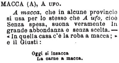 Macca (A), A ufo - A macca, che in alcune provincie si usa per lo stesso che A ufo, cioè Senza spesa, suona veramente In grande abbondanza e senza scelta. - «In quella casa c'è la roba a macca;» e il Giusti: