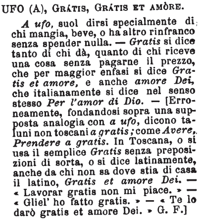Ufo (a), Gratis, Gratis et amore - A ufo, suol dirsi specialmente di chi mangia, beve, o ha altro rinfranco senza spender nulla. - Gratis si dice tanto di chi dà, quanto di chi riceve una cosa senza pagarne il prezzo, che per maggior enfasi si dice Gratis et amore, e anche amore Dei, che italianamente si dice nel senso stesso Per amor di Dio. - [Erroneamente, fondandosi sopra una supposta analogia con a ufo, dicono taluni non toscani a gratis; come Avere, Prendere a gratis. In Toscana, o si usa il semplice Gratis senza preposizione di sorta, o si dice latinamente, anche da chi non sa dove stia di casa il latino, Gratis et amore Dei. - «Lavorar gratis non mi piace.» - «Gliel'ho fatto gratis.» - «Te lo darò gratis et amore Dei.» G. F.] [immagine]