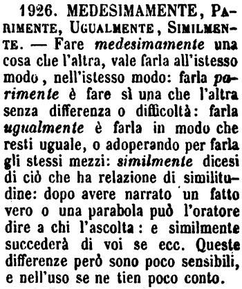 Medesimamente, Parimente, Ugualmente, Similmente - Fare medesimamente una cosa che l'altra, vale farla all'istesso modo, nell'istesso modo: farla parimente è fare sì una che l'altra senza differenza o difficoltà: farla ugualmente è farla in modo che resti uguale, o adoperando per farla gli stessi mezzi: similmente dicesi di ciò che ha relazione di similitudine: dopo avere narrato un fatto vero o una parabola può l'oratore dire a chi l'ascolta: e similmente succederà di voi se ecc. Queste differenze però sono poco sensibili, e nell'uso se ne tien poco conto. [immagine]