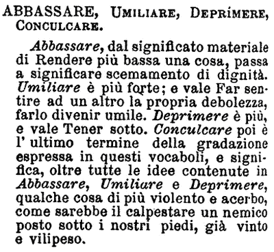 | Abbassare, Umiliare, Deprimere, Conculcare - Abbassare, dal significato materiale di Rendere più bassa una cosa, passa a significare scemamento di dignità. Umiliare è più forte; e vale far sentire ad un altro la propria debolezza, farlo divenir umile. Deprimere è più, e vale Tener sotto. Conculcare poi è l'ultimo termine della gradazione espressa in questi vocaboli, e significa, oltre tutte le idee contenute in Abbassare, Umiliare e Deprimere, qualche cosa di più violento e acerbo, come sarebbe il calpestare un nemico posto sotto i nostri piedi, già vinto e vilipeso. [immagine] |
