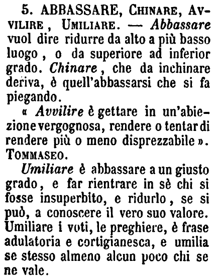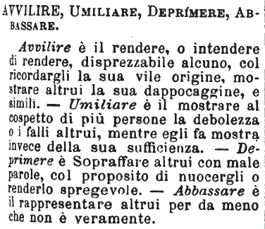 «Avvilire è gettare in un'abiezione vergognosa, rendere o tentar di rendere più o meno disprezzabile». Tommaseo. Umiliare è abbassare a un giusto grado, e far rientrare in sè chi si fosse insuperbito, e ridurlo, se si può, a conoscere il vero suo valore. Umiliare i voti, le preghiere, è frase adulatoria e cortigianesca, e umilia se stesso almeno alcun poco chi se ne vale. [immagine] |