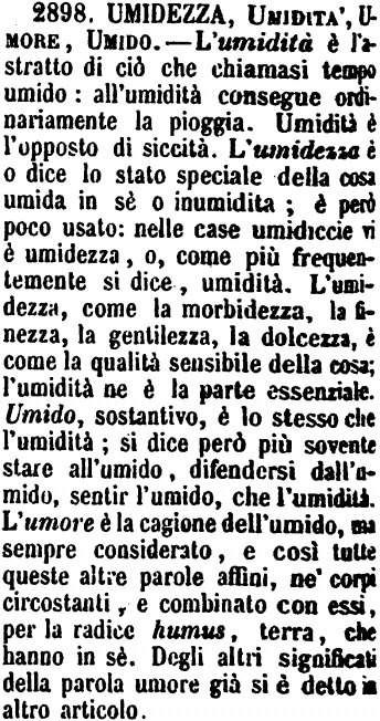 | Umidezza, Umidità, Umore, Umido - L'umidità è l'astratto di ciò che chiamasi tempo umido: all'umidità consegue ordinariamente la pioggia. Umidità è l'opposto di siccità. L'umidezza è o dice lo stato speciale della cosa umida in sè o inumidita; è però poco usato: nelle case umidiccie vi è umidezza, o, come più frequentemente si dice, umidità. L'umidezza, come la morbidezza, la finezza, la gentilezza, la dolcezza, è come la qualità sensibile della cosa; l'umidità ne è la parte essenziale. Umido, sostantivo, è lo stesso che l'umidità; si dice però più sovente stare all'umido, difendersi dell'umido, sentir l'umido, che l'umidità. L'umore è la cagione dell'umido, ma sempre considerato, e così tutte queste altre parole affini, ne' corpi circostanti, e combinato con essi, per la radice humus, terra, che hanno in sè. Degli altri significati della parola umore già si è detto in altro articolo. [immagine] |