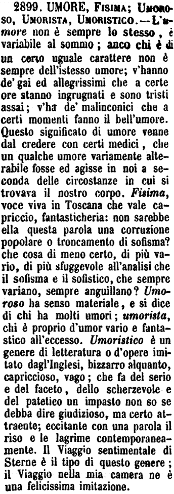 | Umore, Fisima; Umoroso, Umorista, Umoristico - L'umore non è sempre lo stesso, è variabile al sommo; anco chi è di un certo uguale carattere non è sempre dell'istesso umore; v'hanno de' gai ed allegrissimi che a certe ore stanno ingrugnati e sono tristi assai; v'ha de' malinconici che a certi momenti fanno il bell'umore. Questo significato di umore venne dal credere con certi medici, che un qualche umore variamente alterabile fosse ed agisse in noi a seconda delle circostanze in cui si trovava il nostro corpo. Fisima, voce viva in Toscana che vale capriccio, fantasticheria: non sarebbe ella questa parola una corruzione popolare o troncamento di sofisma? che cosa di meno certo, di più vario, di più sfuggevole all'analisi che il sofisma e il sofistico, che sempre variano, sempre anguillano? Umoroso ha senso materiale, e si dice di chi ha molti umori; umorista, chi è proprio d'umor vario e fantastico all'eccesso. Umoristico è un genere di letteratura o d'opere imitato dagl'Inglesi, bizzarro alquanto, capriccioso, vago: che fa del serio e del faceto, dello scherzevole e del patetico un impasto non so se debba dire giudizioso, ma certo attraente; eccitante con una parola il riso e le lagrime contemporaneamente. Il Viaggio sentimentale di Sterne è il tipo di questo genere; il Viaggio nella mia camera ne è una felicissima imitazione. [immagine] |