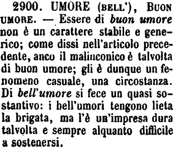 | Umore (bell’), Buon umore - Essere di buon umore non è un carattere stabile e generico; come dissi nell'articolo precedente, anco il malinconico è talvolta di buon umore; gli è dunque un fenomeno casuale, una circostanza. Di bell'umore si fece un quasi sostantivo: i bell'umori tengono lieta la brigata, ma l'è un'impresa dura talvolta e sempre alquanto difficile a sostenersi. [immagine] |