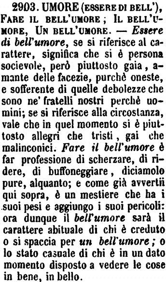 | Umore (essere di bell’), Fare il bell’umore; Il bell’umore, Un bell’umore - Essere di bell'umore, se si riferisce al carattere, significa che si è persona socievole, però piuttosto gaia, amante delle facezie, purchè oneste, e sofferente di quelle debolezze che sono ne' fratelli nostri perchè uomini; se si riferisce alla circostanza, vale che in quel momento si è piuttosto allegri che tristi, gai che malinconici. Fare il bell'umore è far professione di scherzare, di ridere, di buffoneggiare, diciamolo pure, alquanto; e come già avvertii qui sopra, è un mestiere che ha i suoi pesi e aggiungo i suoi pericoli: ora dunque il bell'umore sarà il carattere abituale di chi è creduto o si spaccia per un bell'umore; o lo stato casuale di chi è in un dato momento disposto a vedere le cose in bene, in bello. [immagine] |